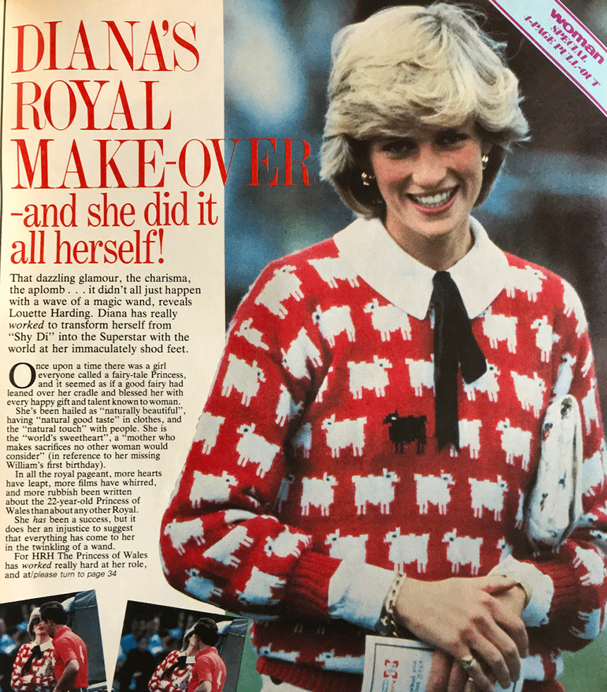 As artists, we've always identified with black sheep ourselves: because of a recessive gene, black sheep are born with black wool in flocks of otherwise white sheep (in a flock of a hundred, there might only be one black sheep!). The sweater seemed to resonate among some other black sheep of the time too: David Bowie, Andy Warhol, Shelley Duvall, Penelope Keith, Anthony Andrews — and, of course, Lady Diana Spencer.